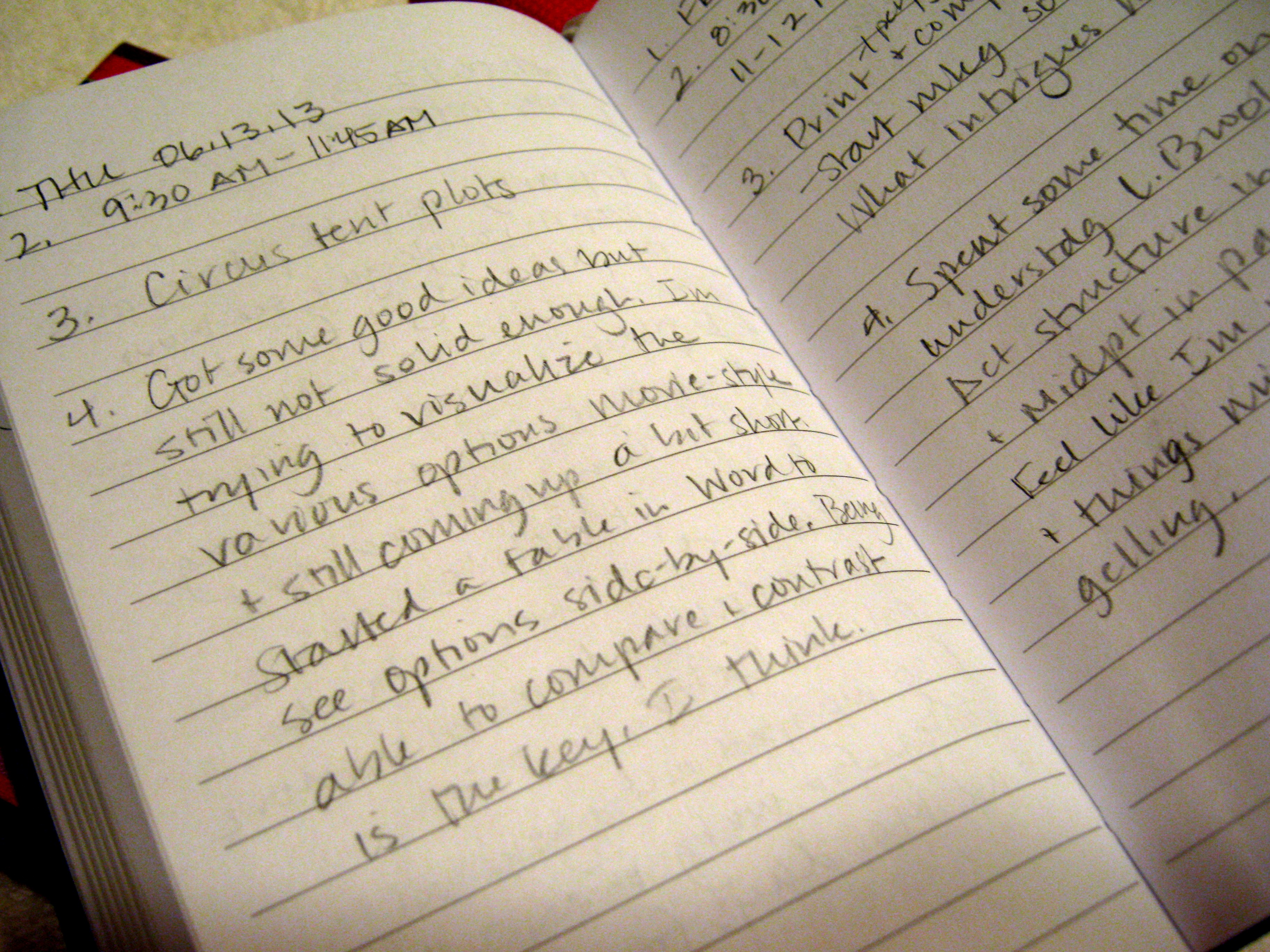 Martin recommends writing 18 hours a week—three hours a day, six days a week. I block out my available writing hours a week or even a month ahead of time. My ability to hit that 18-hour target varies wildly, but I would never come close or even log 20 or 25 hours on an especially good week if I didn’t have a treadmill journal. And it’s invaluable for helping me remember what I need to do next.