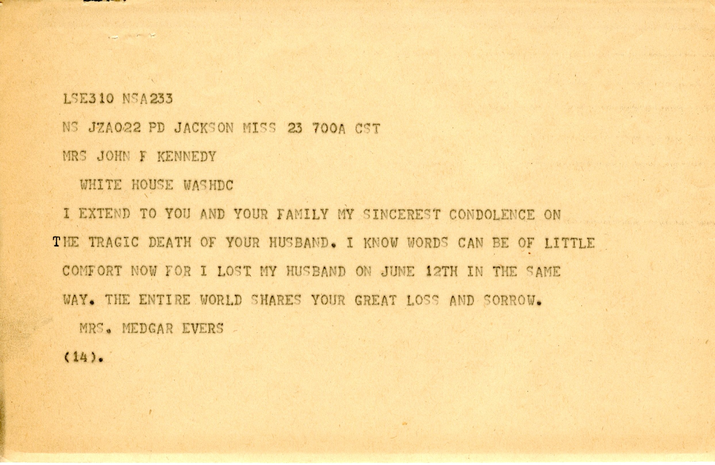 In my research, I also came across the telegram below in which Myrlie reaches out to the newly widowed Jackie Kennedy:
